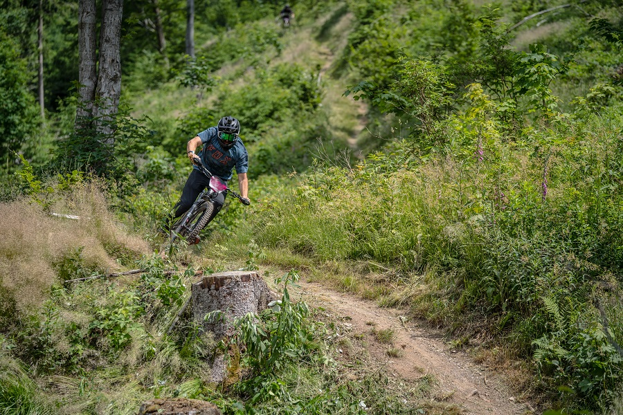 Nach der Stage kurz durchatmen, den Puls etwas runter bringen, dann heißt es eh schon weiter kurbeln zur nächsten Stage. Auf dem Weg zu Stage 3 ging es über den Uphill Flow und es hat wieder angefangen zu regnen. Es gibt keine großen Überraschungen in der Stage, aber dafür ist alles nass, der Boden rutschig und schmierig und auch hier einiges zu treten. Danach also auch wieder rauf kurbeln zur Stage 4. Es ist eine sehr Speed lastige Stage, mit ein paar Stein und Wurzel Feldern. Zuletzt ging es nochmal mit dem Lift zur Stage 5.